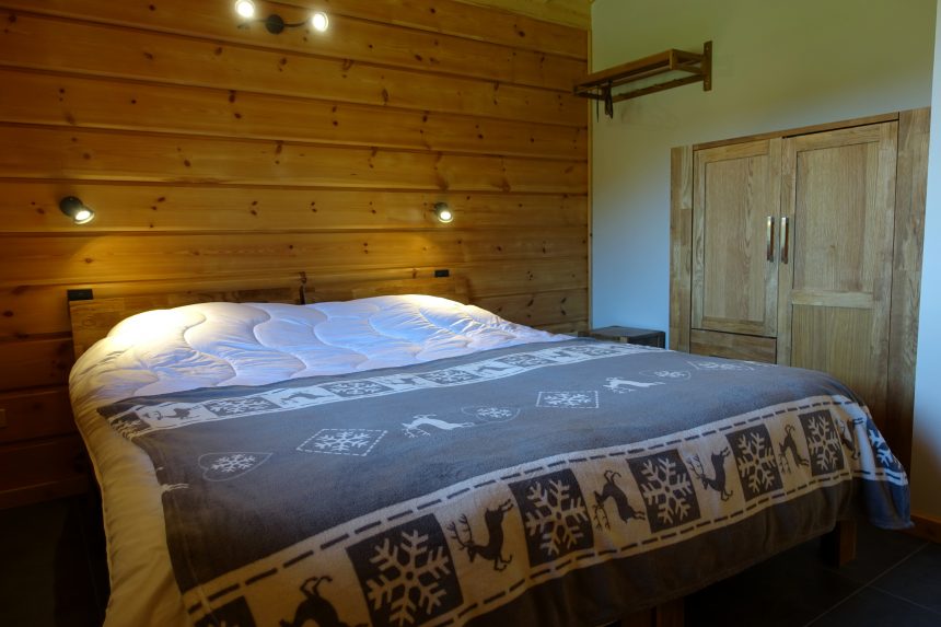 Vapaa-ajan käyttöön rakennetun liimahirsitalon makuuhuone
